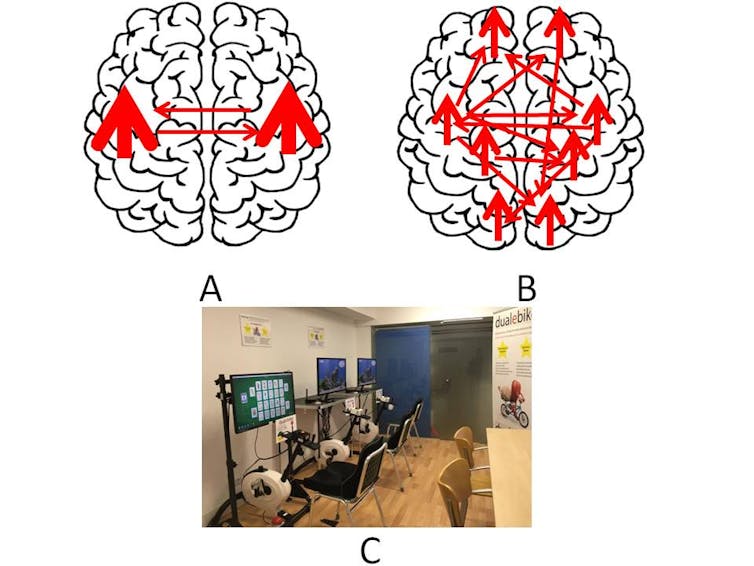 dual que combina el pedaleo con los solitarios de cartas. El paciente pedalea
